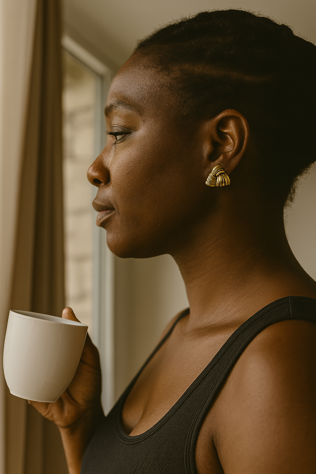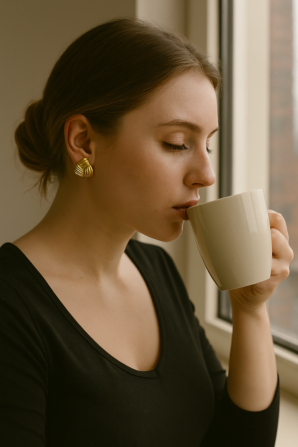 Porte les boucles ÉOLYA avec une queue-de-cheval basse ou un chignon pour mettre en valeur leur forme géométrique. Elles se marient parfaitement avec un collier minimaliste doré pour un look chic et équilibré. 💫